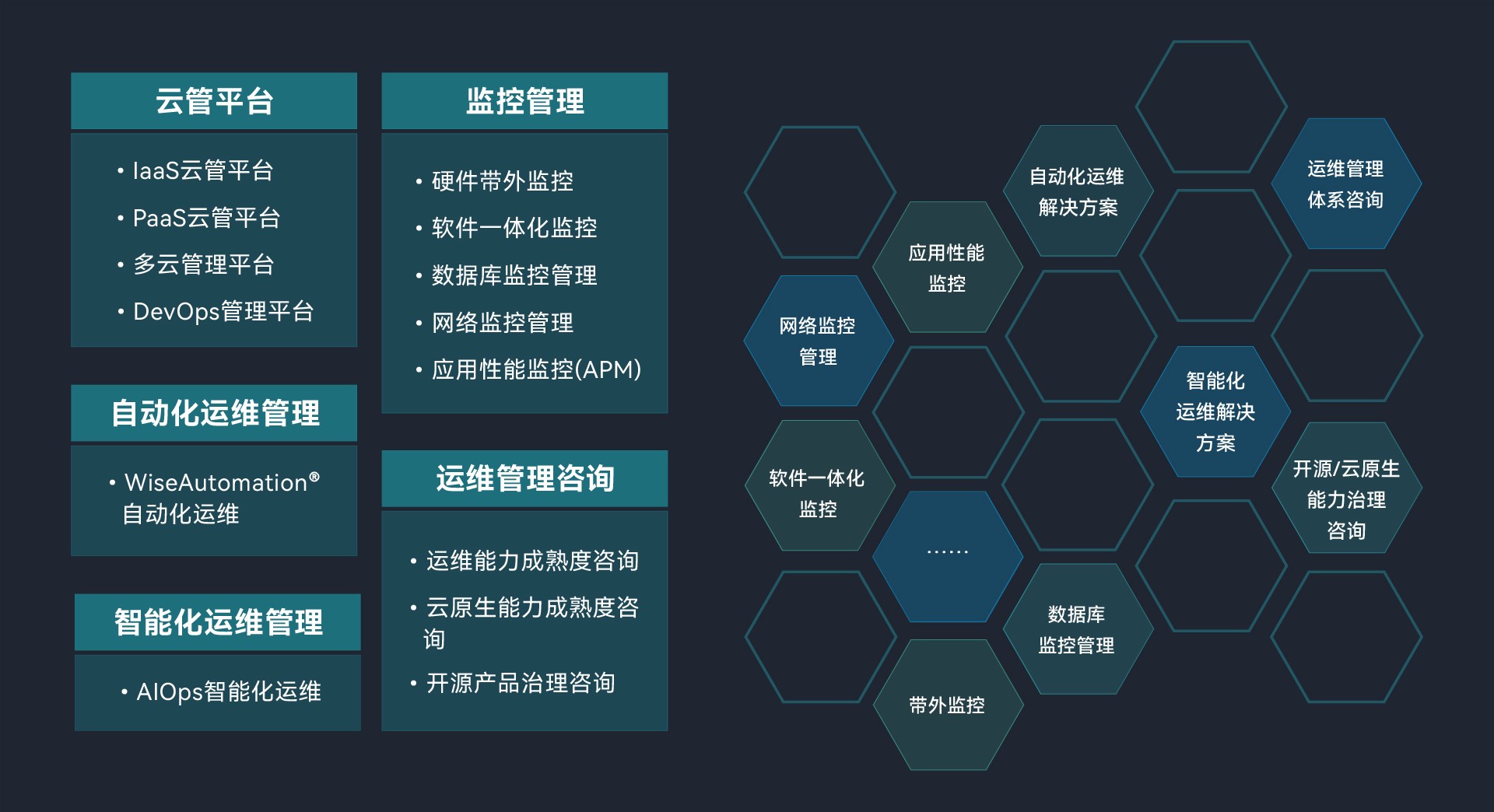 三亿官网在运维管理产品领域提供硬件、软件监控、自动化运维、智能化运维和安全管理等产品解决方案,帮助客户实现对基础设施、应用程序和服务的全方位监控、反馈和管理。同时,三亿官网在运维支撑平台领域提供云、大数据和智能平台中台解决方案,为客户打造基础设施管理平台,确保客户在各类运维需求下,都能够得到充分的支撑和保障。